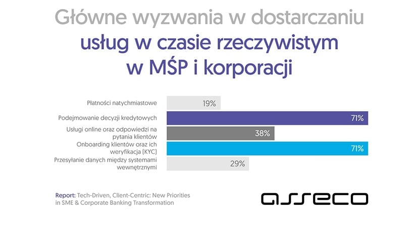 Główne wąskie gardła w dostarczaniu usług w czasie rzeczywistym to decyzje kredytowe i onboarding (po 71%). Problemem nie jest brak wizji, lecz niedostosowana infrastruktura. Wiele instytucji działa w oparciu o przestarzałe systemy i ręczne weryfikacje, które uniemożliwiają szybkie i zautomatyzowane podejmowanie decyzji. Dodatkowym wyzwaniem pozostaje deficyt kompetencji technologicznych i niejednoznaczne regulacje dotyczące wykorzystania AI w procesach kredytowych. Te ograniczenia wymagają od banków odwagi w przeprojektowaniu modeli operacyjnych – z silosów procesowych na architekturę danych i API-first.