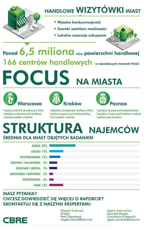 Polski rynek powierzchni handlowych w większości opracowań postrzegany jest jako jedność. Mimo to, każdy z regionów posiada zbiór specyficznych cech, które są dla niego charakterystyczne. Różnice dotyczą struktury najemców ulokowanych w centrach handlowych, wskaźnika siły nabywczej, wysokości czynszów czy nasycenia rynku powierzchnią handlową. Z tego powodu CBRE postanowiło poddać dokładnej analizie każdy region i stworzyć dedykowaną dla każdego regionu Handlową Wizytówkę Miasta, która zawiera kluczowe i charakterystyczne informacje dla danego rynku. Oprócz analizy SWOT, infografik z kluczowymi danymi, każda wizytówka posiada mapę danego obszaru pokazującą rozmieszczenie istniejących i planowanych obiektów handlowych. Takie opracowanie zdecydowanie ułatwia rozumienie rynku najemcom rozważającym ekspansję, a także deweloperom planującym inwestycje.