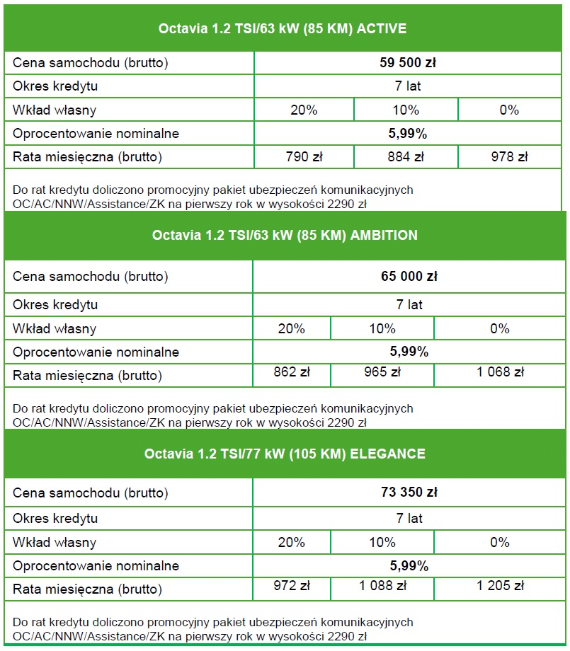 130217.skoda.02.249x171W ramach oferty finansowej ŠKODA Finance, dzięki ŠKODA Kredyt 5,99% właścicielem nowej ŠKODY Octavia można zostać płacąc już 790 zł miesięcznie. Jest to idealne rozwiązanie dla tych, którzy chcą sfinansować nowy model w całości za pomocą kredytu, nie angażując do tego środków własnych. Kredyt jest przyznawany na okres od 1 roku do 7 lat. Najważniejszą zaletą produktu jest niskie oprocentowanie 5,99% dla wszystkich okresów finansowania.