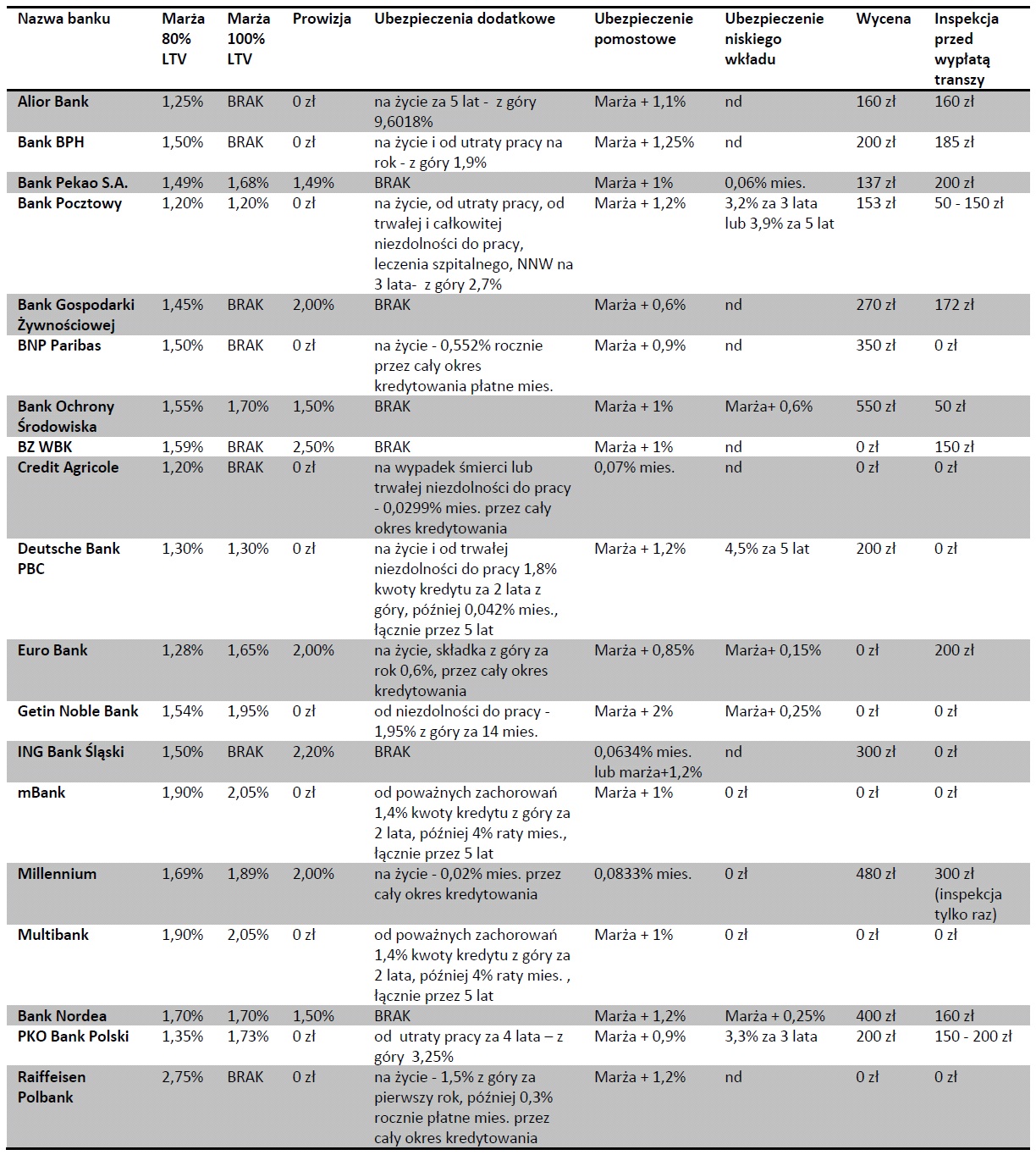 Bez względu na cel kredytowania istotna jest oczywiście cena kredytu, czyli głównie marża, od której zależy oprocentowanie, prowizja i ubezpieczenia (ubezpieczenie niskiego wkładu, na życie, od utraty pracy) oraz koszt oszacowania wartości mieszkania. Ranking pomija konieczność skorzystania z dodatkowych produktów (konto, karta kredytowa, ubezpieczenie nieruchomości), na które klient musi się zdecydować, aby osiągnąć dane warunki cenowe. Taki cross-sell jest na tyle powszechny, że nie różnicuje już w praktyce ofert.