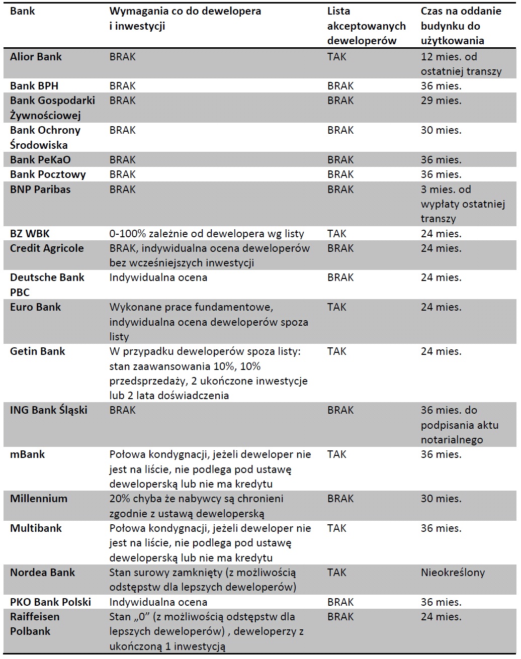 Kupujący używane mieszkania mają większy wybór ofert niż zainteresowani nowymi lokalami. W tym drugim przypadku banki mogą stawiać wymagania dotyczące stanu zaawansowania inwestycji, czy kredytować jedynie określonych deweloperów. Część banków analizuje kondycję każdego nowego dewelopera, od którego wnioskujący klient chce kupić mieszkanie i wpisuje go w przypadku akceptacji na wewnętrzną listę. Oznacza to w praktyce, że im lepsza reputacja dewelopera i im więcej wykonanych prac na budowie, tym więcej banków będzie skłonnych udzielić kredytu. Z kolei kupujący mieszkania od lokalnego małego dewelopera sprzedającego mieszkania w pierwszym budowanym przez siebie bloku na etapie „dziury w ziemi” będą mieć znaczne mniejsze pole manewru. Niektóre banki nie sfinansują takiej inwestycji, ponieważ deweloper nie ukończy jej w wymaganym przez bank terminie. Z tego powodu oddzielnie w rankingu opisane są kryteria akceptacji inwestycji przez bank. Skrajnym podejściem cechuje się tutaj Citi Handlowy, który kredytuje jedynie gotowe mieszkania i z tego powodu nie został ujęty w zestawieniu.![]()
