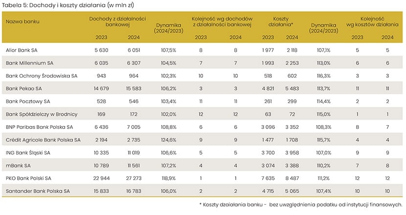 Pod względem wielkości kosztów działania banków, rozumianych jako koszty ogólnego zarządu (obejmujące koszty pracownicze oraz amortyzację), nie nastąpiły znaczne zmiany w klasyfikacji poszczególnych podmiotów i są one przede wszystkim wynikiem wielkości danej instytucji. Najwyższe wydatki w tym zakresie występują w przypadku PKO Banku Polskiego, Banku Pekao oraz Santander Banku Polska.