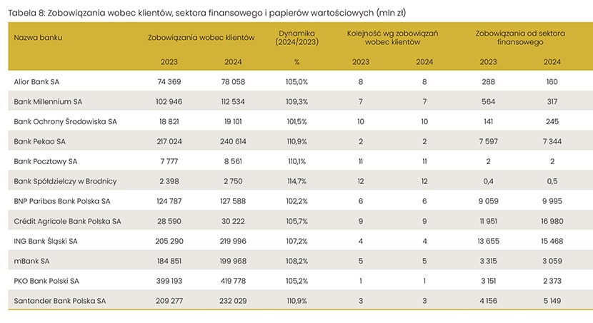 Tegoroczne zestawienie ilustruje kontynuację trendu zwiększania bankowych zobowiązań wobec klientów. Żaden nie odnotował spadku wartości depozytów klientowskich. Natomiast cztery zwiększyły tą pozycję o ponad 10%. Były to kolejno: Bank Spółdzielczy w Brodnicy, Santander Bank Polska, Bank Pekao i Bank Pocztowy. Średnia dynamika dla wszystkich analizowanych podmiotów wyniosła 7,6%. Warto zwrócić uwagę, że choć jeszcze w ubiegłym roku była ona zdecydowanie niższa niż w przypadku całego sektora bankowego, to tym razem jest zbliżona. Według danych publikowanych na stronach Komisji Nadzoru Finansowego, roczny wzrost wartości tej pozycji we wszystkich bankach działających na polskim rynku wyniósł ok. 7,8%,