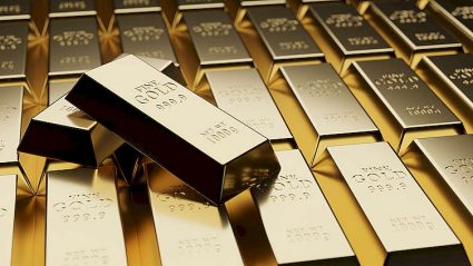 sztabki złota na tle ekranu notowań giełdowych